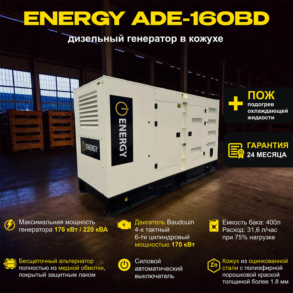 Дизельный генератор ENERGY ADE-160BD в кожухе мощностью 160 кВт / 200 кВа вырабатывает переменный ток напряжением промышленной частоты. Назначение — обеспечение электропитания объектов с низким и средним потреблением энергии — загородных домов, автомастерских, магазинов, кафе, школ, больниц, строительных объектов, ферм. Мобильность установки позволяет использовать ДГУ в роли передвижной электростанции, установив на кузов автомобиля, прицеп трактора или шасси.